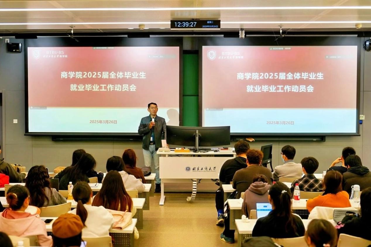 为做好2025届毕业生就业工作,3月26日探花视频 在文二402、403召开“爱商未来”探花视频 2025届毕业生就业动员会。探花视频 党委副书记张悦、副院长仇勇,辅导员邵杰、王阔,500余名本科毕业生参加本次大会。