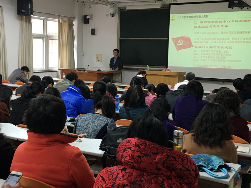 会议首先由党委书记毛新述为全体教师讲解《党的十九大的主要精神和重要贡献》。毛书记从十九大的召开、十九大精神的学习宣传贯彻和十九大的主要精神与重大贡献三个方面着手,深入浅出地带领大家领会党的十九大主题,了解十八大以来党和国家取得的历史性成就,认识十九大的重要意义。毛书记号召大家要将十九大主题铭记在心,“不忘初心,牢记使命”,顺应时代的呼唤,在各自的岗位上尽职尽责,投身新时代建设。