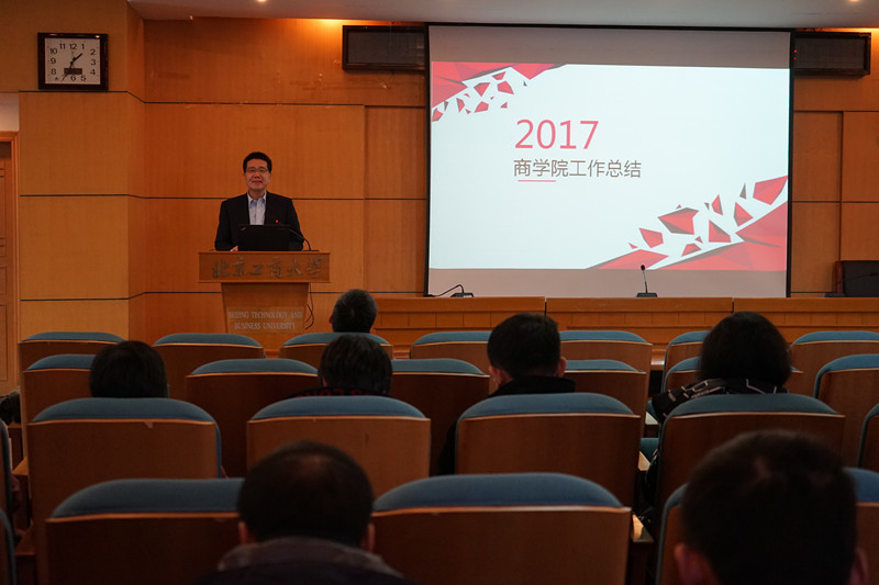 王院长回顾总结了2017年度学院在本科教学、学风建设、研究生培养、科学研究、学科建设、国际化、队伍建设、行政工作、党建群工、文化建设、校友工作等方面的工作,用详实的数据、事例进行说明。