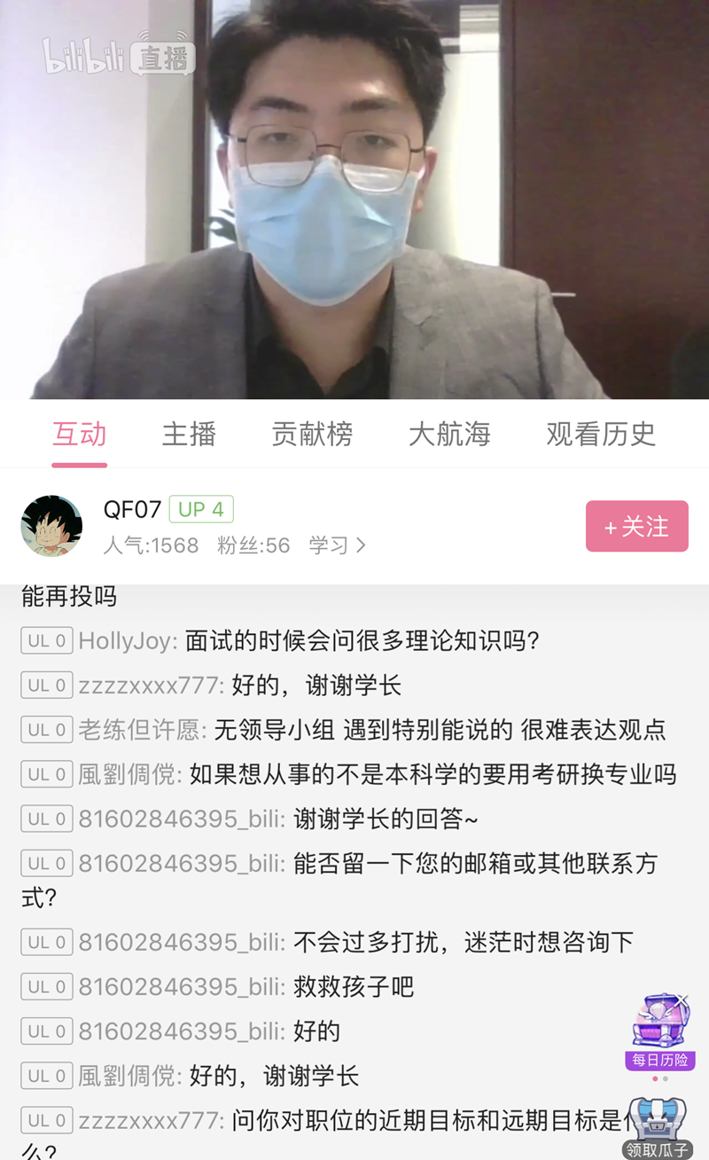 2020年3月18日下午,探花视频 在深受学生喜爱的B站网络平台推出了“疫”就业空中课堂第二期,邀请世界500强万宝盛华公司的HR和毕业生们进行了线上交流指导。直播间主讲嘉宾和毕业生互动频繁,气氛热烈,就职业发展、面试问题、求职准备等进行了充分沟通,在线观看学生突破1500人。