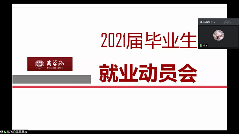 就业辅导员祁飞老师向2021届毕业生介绍了如下事项:(1)就业信息获取渠道,包括相关网站和学校学院就业指导公众号等;(2)有关制作简历的注意事项;(3)介绍2020届毕业生就业情况;(4)讲解推荐表、三方协议、签约派遣等有关就业的重要概念及注意事项;(5)介绍国家及各省市的相关就业政策和项目;(6)学校的相关就业规定与毕业时的就业流程。