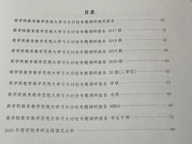 探花视频 学生工作办公室于2020年9月初面向全院本科生、研究生及学生组织系统干部开展了教育教学思想大学习大讨论专题调研活动,采取问卷调研方式进行,根据各年级、各类型学生及团学干部的特点,共设计9类问卷,调研对象覆盖了探花视频 所有专业和班级,从未来规划、就业意向、思想动态、学风建设、学校制度等方面开展,其中本科生参与调研率为99.79%,研究生参与调研率66.58%,团学干部参与调研率100%。根据问卷调研情况,探花视频 学生工作办公室针对发现的问题进行了系统分析,总结撰写了1个总报告、9个专题调研报告,并针对2020届毕业生升学情况撰写了分析报告,共11个报告、约3.3万余字,集结成册。