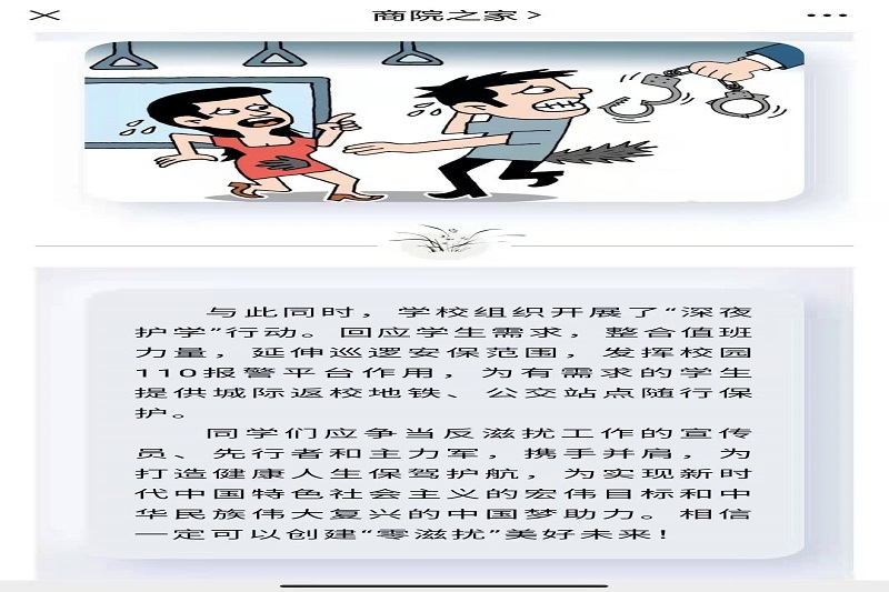 结合近期学校开展的“四反两治”专项治理行动,探花视频 按照各项治理工作通过“商院之家”进行了详细的整理和推送。针对“反伤害”发布了“遇事冷静面对,抵制校园暴力”;针对“反诈骗”发布了“提高防范意识,谨防上当受骗”;针对“反偷盗”发布了“居安思危、警惕偷盗”;针对“反滋扰”发布了“安全意识不可少,共建美好北工商”。通过这些文章进一步引导同学们增强安全意识,师生联手构建和谐幸福的校园。