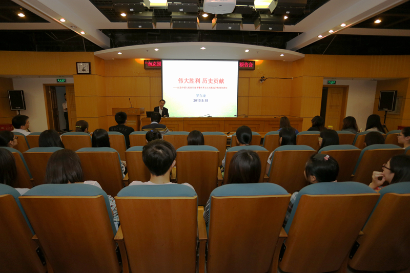 罗存康馆长的报告从局部抗战到全民族抗战,团结抗战的中流砥柱,东方主战场,伟大胜利、正义审判,铭记历史、开创未来等五个方面阐述抗日战争是近代以来中华民族抵御外来侵略第一次取得的伟大胜利,中国人民抗日战争为世界反法西斯战争、人类和平作出了彪炳史册的历史贡献。现场同学认真聆听,报告发人深省、令人触动,引发了同学们的思考。